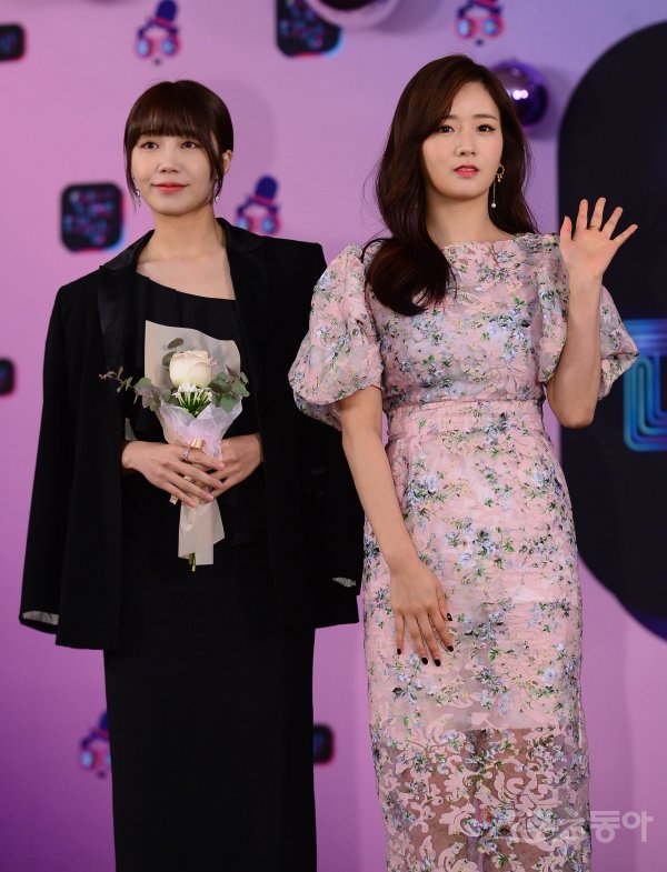 에이핑크 멤버 정은지(왼쪽)와 윤보미가 21일 서울 영등포구 KBS 본관 로비에서 열린 ‘2019 KBS 연예대상’ 포토월에서 포즈를 취하고 있다. 주현희 기자 teth1147@donga.com