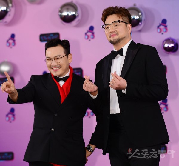 방송인 딩동(왼쪽)과 가수 김태우가 21일 서울 영등포구 KBS 본관 로비에서 열린 ‘2019 KBS 연예대상’ 포토월에서 포즈를 취하고 있다. 주현희 기자 teth1147@donga.com