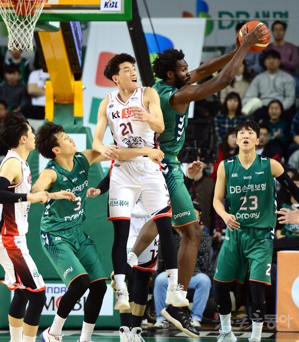 22일 원주종합체육관에서 열린 ‘2019-2020 현대모비스 프로농구’ 부산 KT와 원주 DB의 경기에서 DB 오누아쿠가 리바운드 볼을 잡고 있다.