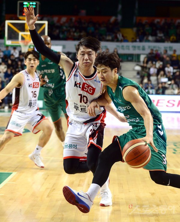 22일 원주종합체육관에서 열린 ‘2019-2020 현대모비스 프로농구’ 부산 KT와 원주 DB의 경기에서 DB 허웅이 KT 최성모의 수비를 뚫고 골밑을 공격하고 있다.