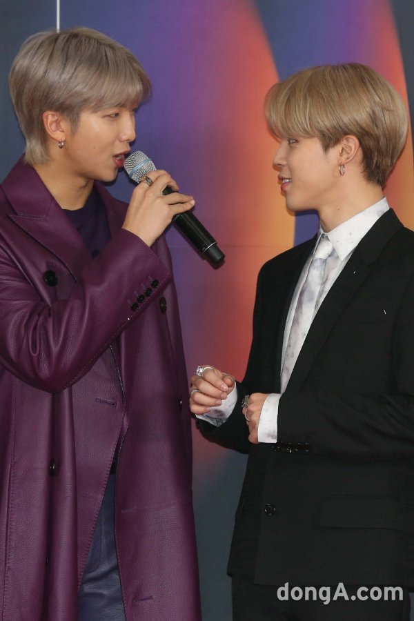 그룹 방탄소년단의 RM(왼쪽)과 지민이 25일 오후 서울 구로구 고척스카이돔에서 열린 \'2019 SBS 가요대전\' 포토월에 참석하고 있다.
