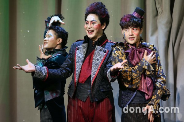 배우 육현욱, 장지후, 강하늘이 26일 오후 서울 성북구 동덕여대에서 열린 연극 \'환상동화\' 프레스콜 행사에서 하이라이트 공연을 선보이고 있다.