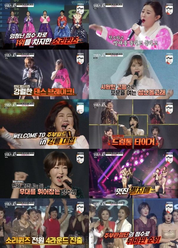 지난 방송에 이어 시작된 ‘소리퀸즈’(조엘라, 이미리, 전영랑, 박연희, 이유나)는 국악 최강자들이 모인 팀다운 판소리 무대로 관객을 압도했다. 우리 가락을 맛깔나게 들려준 ‘소리퀸즈’는 이어 주부들의 공감을 저격하는 개사로 ‘천태만상’을 불렀다. 집안일, 육아, 명절 스트레스에 “경력단절이 웬말이냐”라고 외치는 ‘소리퀸즈’의 센스 있는 개사는 강릉 주부판정단들의 어깨를 들썩이게 했다.