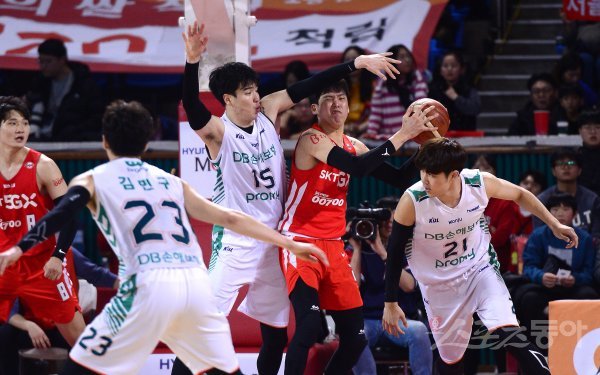 29일 잠실학생체육관에서 열린 ‘2019-2020 현대모비스 프로농구’ 원주 DB와 서울 SK 경기에서 SK 최준용 DB 김종규의 수비를 뚫고 골밑을 공격을 하고 있다.