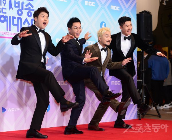 방송인 전현무, 강사 설민석, 유병재, 가수 김종민(왼쪽부터)이 29일 서울 마포구 MBC 미디어센터 공개홀에서 열린 ‘2019 MBC 방송연예대상’ 포토월에서 포즈를 취하고 있다.
