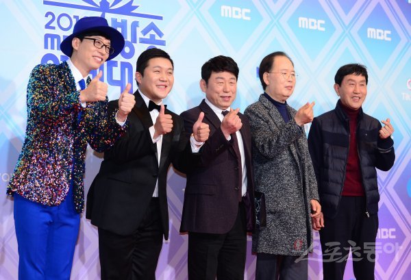 개그맨 유재석, 조세호, 음악프로듀서 박현우, 정경철, 이건우(왼쪽부터)가 29일 서울 마포구 MBC 미디어센터 공개홀에서 열린 ‘2019 MBC 방송연예대상’ 포토월에서 포즈를 취하고 있다.