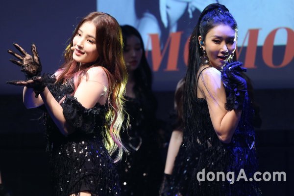 그룹 모모랜드의 낸시(왼쪽)와 혜빈이 30일 오후 서울 용산구 블루스퀘어에서 열린 두 번째 싱글 앨범 \'Thumbs Up\' 발매 쇼케이스에서 새로운 무대를 선보이고 있다.