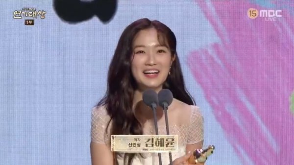 신인상의 주인공은 김혜윤. 김혜윤은 “올해 작품 2개나 할 수 있다는 거에 감사했다. 많은 사랑을 받은 한 해였다. 특히 2학년 7반 친구들 고맙다”며 드라마 제작진과 지인들에게 감사 인사를 보냈다.