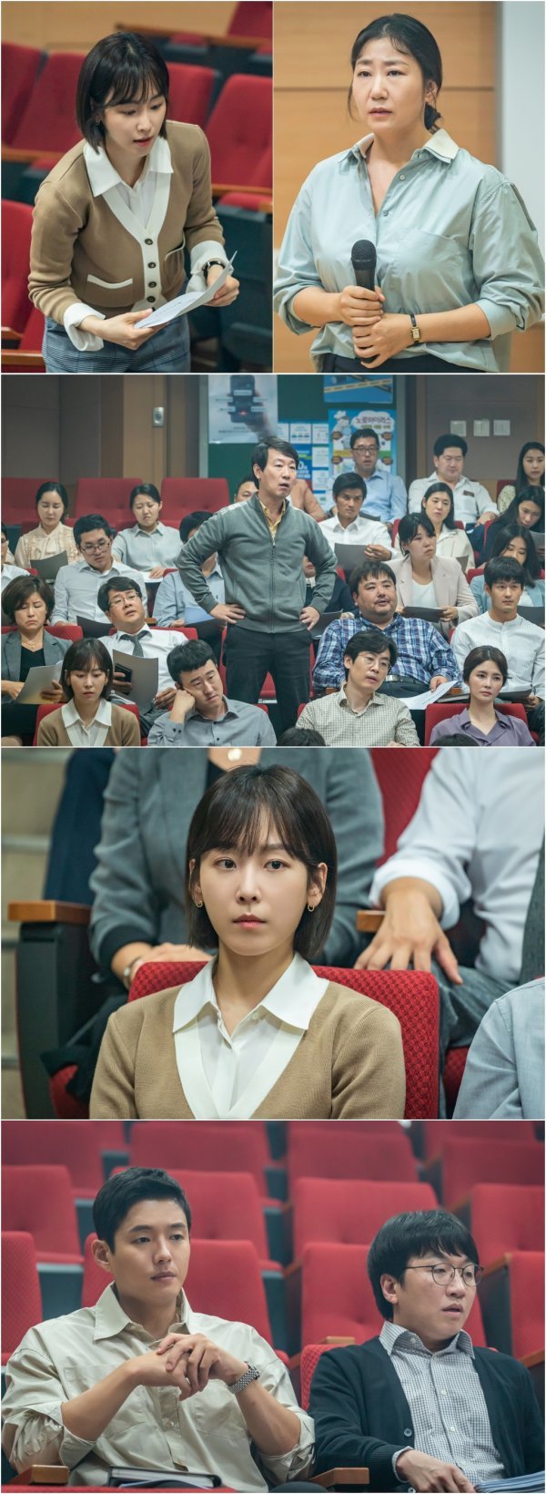 그런 가운데 공개된 사진에는 학교 시스템 문제를 공론화하기 위해 나선 진학부의 모습이 담겨있다. ‘심화반’ 동아리 개설을 앞두고 선생님들이 회의실에 빼곡히 자리한 가운데, 마이크를 쥐고 선 진학부장 박성순(라미란 분)의 모습이 눈길을 사로잡는다. ‘이 구역 미친개’를 자처하며 부당한 일에 늘 먼저 맞서왔던 박성순도 이날만큼은 긴장감이 역력한 표정이다. 그의 곁을 묵묵히 지키는 진학부 식구들의 표정도 무겁기는 마찬가지다.
