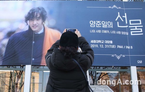 31일 오후 서울 광진구 세종대학교 대양홀에서 열린 가수 양준일 팬미팅에 앞서 한 팬이 기념사진을 찍고 있다. 동아닷컴 국경원 기자 onecut@donga.com
