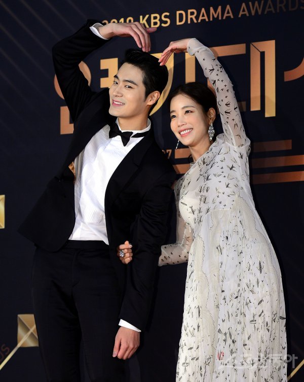 31일 서울 KBS홀에서 열린 ‘2019 KBS 연기대상’ 시상식에 참석한 배우 차서원, 기은세가 카메라를 향해 포즈를 취하고 있다.