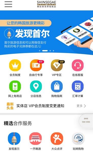 신세계면세점은 모바일 메신저 위챗 미니앱에 여행서비스 앱 ‘디스커버서울’을 탑재했다. 약 11억 명의 사용자를 보유한 위챗을 통해 별도의 앱 다운로드 없이 간편하게 사용할 수 있다. 서울시 공식 관광정보 사이트 ‘VISIT SEOUL’의 정보를 활용해 테마별, 코스별로 여행 정보를 제공하고 사용자의 위치를 기반으로 주변 맛집과 관광 명소도 추천한다. 또한 레져, 맛집, 관광 명소 등의 티켓을 앱에서 판매하며 위챗페이로 바로 구매할 수 있다.