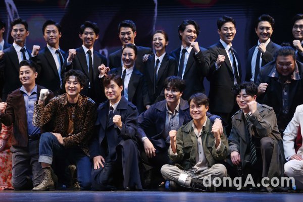 2일 서울 서초구 한전아트센터에서 열린 뮤지컬 \'영웅본색\' 프레스콜행사에서 출연진이 포토타임을 갖고 있다.
