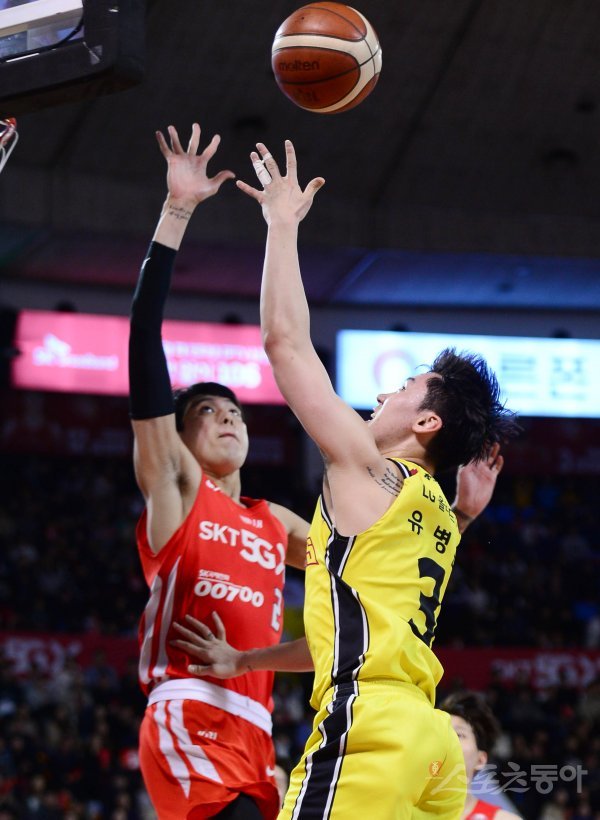 4일 서울 잠실학생체육관에서 열린 ‘2019-2020 현대모비스 프로농구’ 서울 SK와 창원 LG의 경기에서 SK 최준용이 LG 유병훈을 블록슛하고 있다.