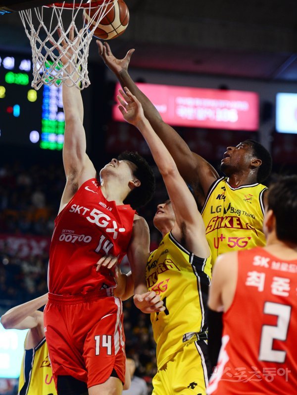 4일 서울 잠실학생체육관에서 열린 ‘2019-2020 현대모비스 프로농구’ 서울 SK와 창원 LG의 경기에서 SK 최부경과 LG 라렌이 리바운드 다툼을 하고 있다.