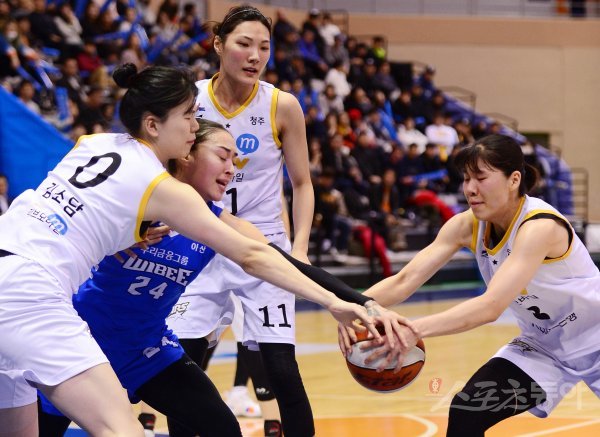 6일 아산이순신체육관에서 열린 ‘하나원큐 2019-2020 여자프로농구’ 아산 우리은행과 청주 KB의 경기에서 우리은행 김소니아(가운데)와 KB 김소담(왼쪽), 김민정이 공을 잡기 위해 손을 뻗고 있다.