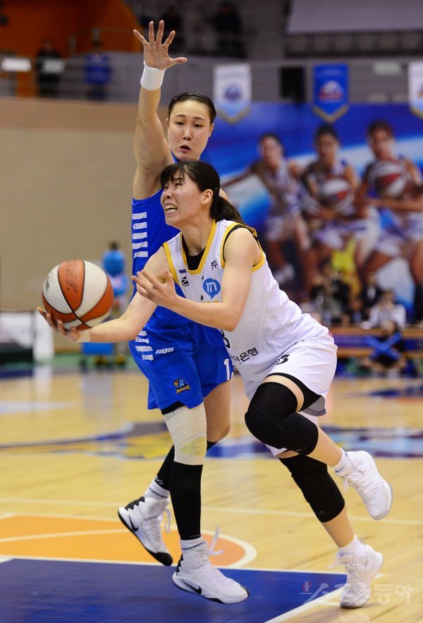6일 아산이순신체육관에서 열린 ‘하나원큐 2019-2020 여자프로농구’ 아산 우리은행과 청주 KB의 경기에서 KB 김민정이 우리은행 김정은을 피해 슛을 쏘고 있다.