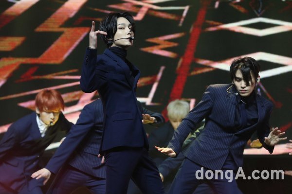 그룹 SF9의 주호가 7일 오후 서울 용산구 블루스퀘어에서 열린 정규 1집 \'FIRST COLLECTION\' 쇼케이스에서 새로운 무대를 선보이고 있다. 동아닷컴 국경원 기자 onecut@donga.com