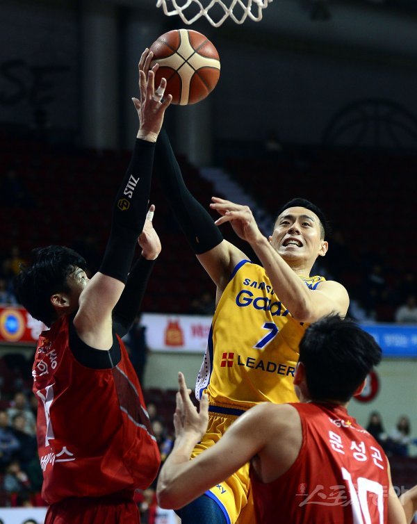 7일 경기도 안양체육관에서 열린 ‘2019-2020 현대모비스 프로농구’ 안양 KGC와 서울 삼성의 경기에서 삼성 이관희가 KGC 양희종의 수비를 피해 슛을 쏘고 있다.