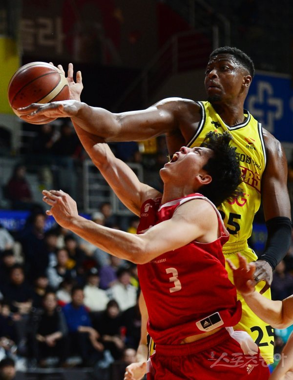 9일 고양체육관에서 열린 ‘2019-2020 현대모비스 프로농구’ 고양 오리온과 창원 LG의 경기에서 LG 라렌이 오리온 임종일의 슛을 블록하고 있다.