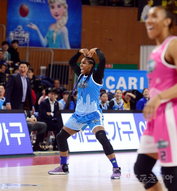 12일 부산 스포원파크 BNK센터에서 열린 ‘하나원큐 2019-2020 여자프로농구’ 올스타전 경기에서 블루스타 그레이가 3점슛을 성공한 뒤 환호하고 있다.