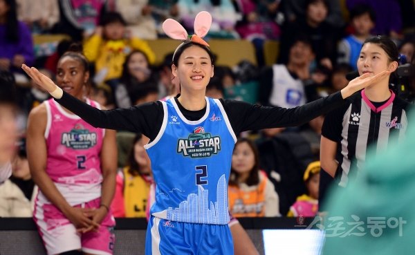 12일 부산 스포원파크 BNK센터에서 열린 ‘하나원큐 2019-2020 여자프로농구’ 올스타전 경기에서 3점슛 콘테스트 결선에 참가한 강이슬이 등장하고 있다.