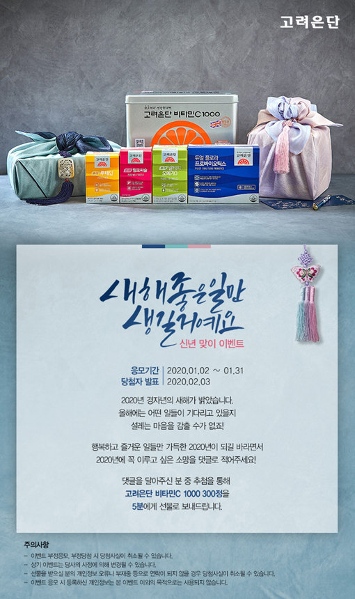 응모자 중 추첨을 통해 선정된 5명에게 ‘고려은단 비타민C 1000 300정’을 증정한다. 당첨자는 2월 3일 홈페이지에서 확인할 수 있다. 고려은단 관계자는 “2020년에는 건강도 챙기고 원하는 일도 다 이룰 수 있는 한 해가 되길 바란다”고 전했다.