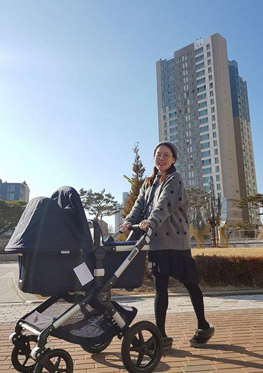 함께 공개한 사진 속 박슬기는 아파트 단지에서 빈 유모차를 끌며 포즈를 취한다.