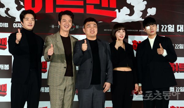 배우 권상우, 정준호, 최원섭 감독, 황우슬혜, 이이경이 14일 서울 광진구 자양동 롯데시네마 건대입구에서 진행된 영화 ‘히트맨’ 언론시사회에 참석해 포토타임을 갖고 있다.