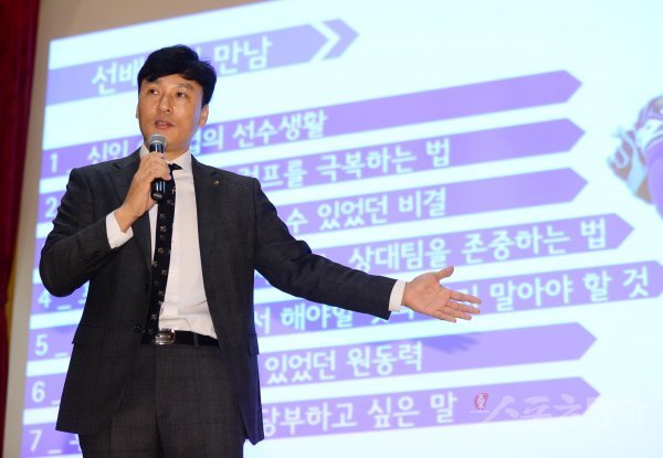 KBO 이승엽 홍보대사가 16일 대전 유성구 대전컨벤션센터에서 열린 ‘2020 KBO 신인 오리엔테이션’에서 신인 선수들에게 강의를 하고 있다.
