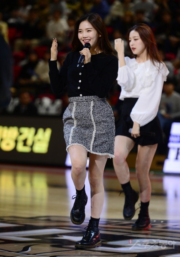 19일 인천 삼산월드체육관에서 열린 ‘2019-2020 현대모비스 프로농구’ 올스타전에서 오마이걸 효정이 축하공연을 펼치고 있다.