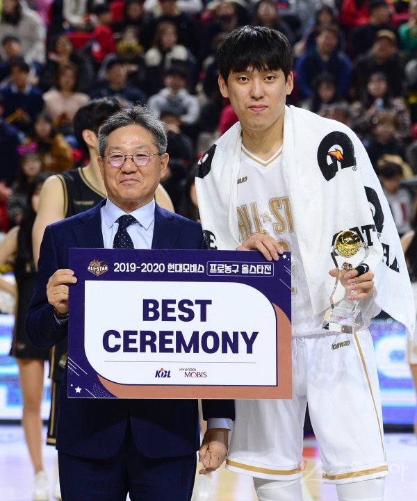 19일 인천 삼산월드체육관에서 열린 ‘2019-2020 현대모비스 프로농구’ 올스타전에서 팀김시래 최준용이 베스트 세리머니 상을 받고 기념 촬영을 하고 있다.