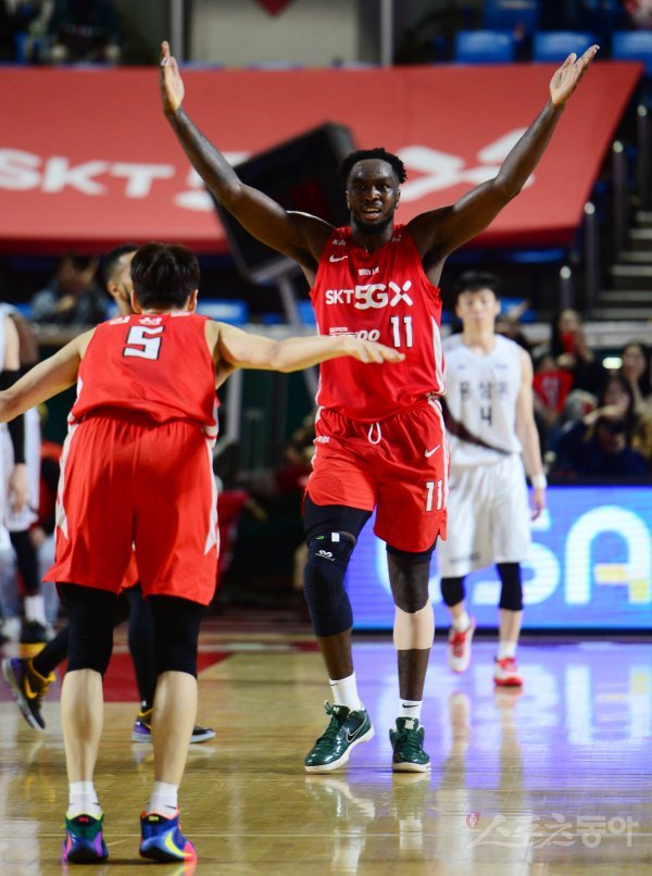 27일 서울 송파구 잠실학생체육관에서 열린 ‘2019-2020 현대모비스 프로농구’ 서울 SK와 안양 KGC의 경기에서 SK 워니가 득점 후 기뻐하고 있다.