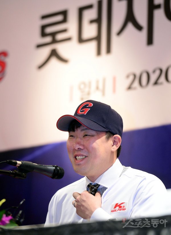 롯데자이언츠와 자유계약선수(FA) 계약을 한 안치홍이 28일 부산 롯데호텔에서 열린 입단식에서 취재진의 질문에 대답하고 있다.