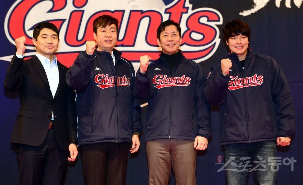 롯데 자이언츠 시무식과 신임대표 취임식이 28일 부산 롯데호텔에서 선수단 및 임직원 일동이 참석한 가운데 열렸다. 이석환 신임대표가 성민규 단장, 허문회 감독, 주장 민병헌과 기념촬영을 하고 있다.