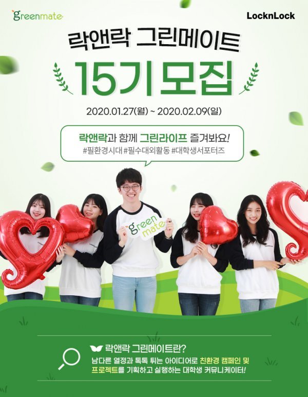 락앤락이 2월 9일까지 대학생 친환경 서포터즈 ‘그린메이트 15기’(사진)를 모집한다.