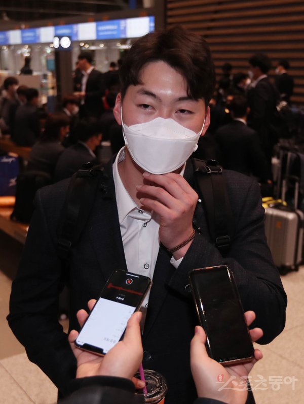 프로야구 KIA가 30일 인천국제공항 2터미널을 통해 미국 플로리다로 전지훈련을 떠났다. KIA 문경찬이 취재진과 인터뷰하고 있다.