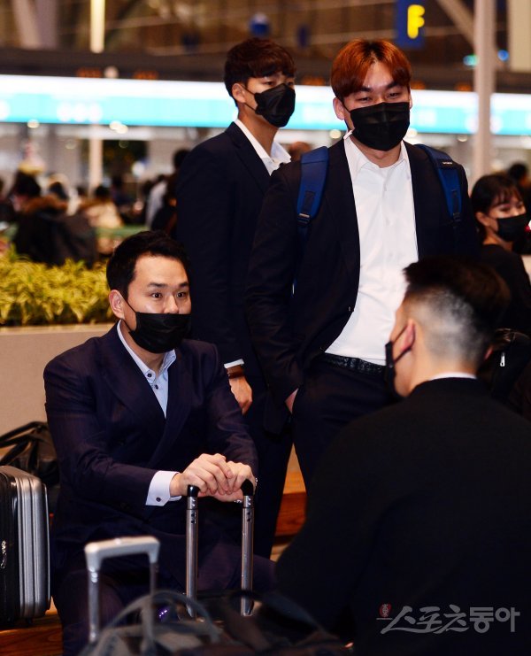 프로야구 KIA가 30일 인천국제공항 2터미널을 통해 미국 플로리다로 전지훈련을 떠났다. KIA 나주환(왼쪽)과 홍상삼이 이야기 나누고 있다.