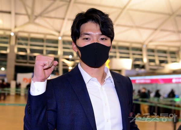프로야구 삼성이 30일 인천국제공항을 통해 일본 오키나와로 전지훈련을 떠났다. 삼성 주장 박해민이 카메라를 향해 포즈를 취하고 있다.