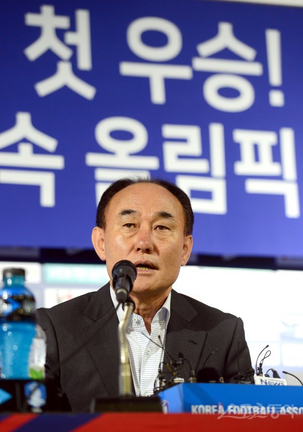 AFC U-23 첫 우승과 세계 최초 9회 연속 올림픽 진출을 이뤄낸 김학범 감독이 30일 서울 종로구 신문로 축구회관에서 기자간담회를 갖고 취재진의 질문에 대답하고 있다.
