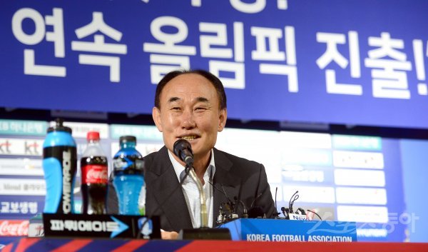 AFC U-23 첫 우승과 세계 최초 9회 연속 올림픽 진출을 이뤄낸 김학범 감독이 30일 서울 종로구 신문로 축구회관에서 기자간담회를 갖고 취재진의 질문에 대답하고 있다.