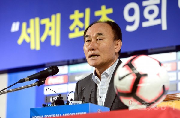 AFC U-23 첫 우승과 세계 최초 9회 연속 올림픽 진출을 이뤄낸 김학범 감독이 30일 서울 종로구 신문로 축구회관에서 기자간담회를 갖고 취재진의 질문에 대답하고 있다.