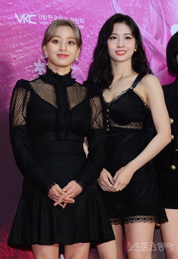 트와이스 지효(왼쪽)와 모모가 30일 서울 구로구 고척스카이돔에서 열린 ‘제29회 하이원 서울가요대상’ 레드카펫에서 포즈를 취하고 있다. 주현희 기자 teth1147@donga.com
