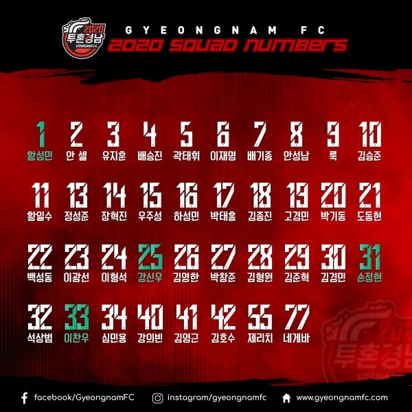 프로축구 K리그2 경남FC(대표이사 박진관)가 2020시즌 배번을 최종 확정했다.
