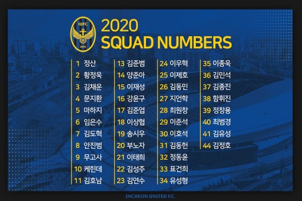 프로축구 K리그1 인천 유나이티드의 2020시즌 프로선수단 등번호가 공개됐다.