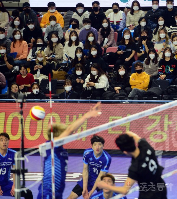 2일 충남 천안 유관순체육관에서 ‘2019-2020 도드람 V리그’ 천안 현대캐피탈과 인천 대한항공의 경기가 열렸다. 배구팬들이 신종 코로나 바이러스에 대비해 마스크를 쓴채 경기를 지켜보고 있다.