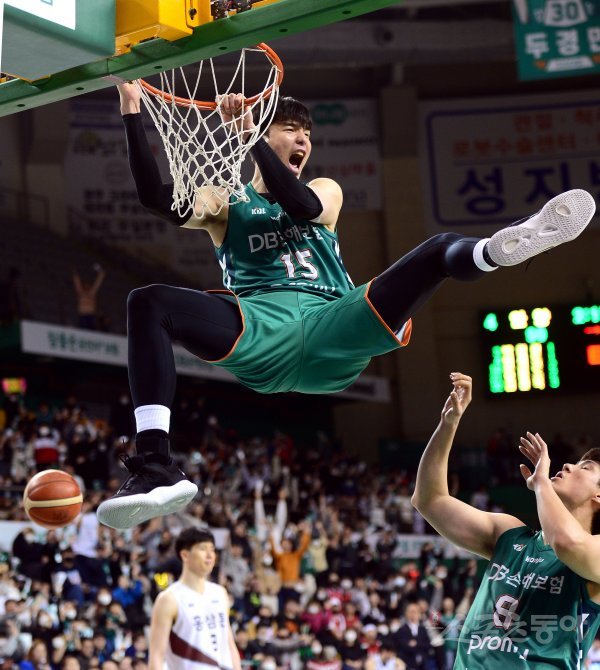 2일 원주종합체육관에서 열린 ‘2019-2020 현대모비스 프로농구’ 원주 DB와 안양 KGC인삼공사 경기 연장전 DB 김종규가 덩크슛을 성공시키고 있다.