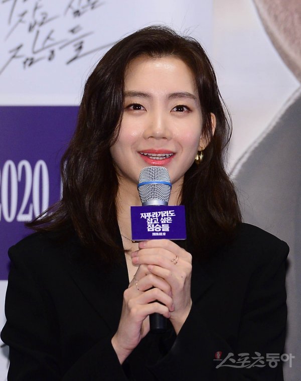 배우 신현빈이 3일 서울 강남구 삼성역 메가박스 코엑스에서 열린 영화 ‘지푸라기라도 잡고 싶은 짐승들’ 언론시사회에 참석해 인사말을 하고 있다.