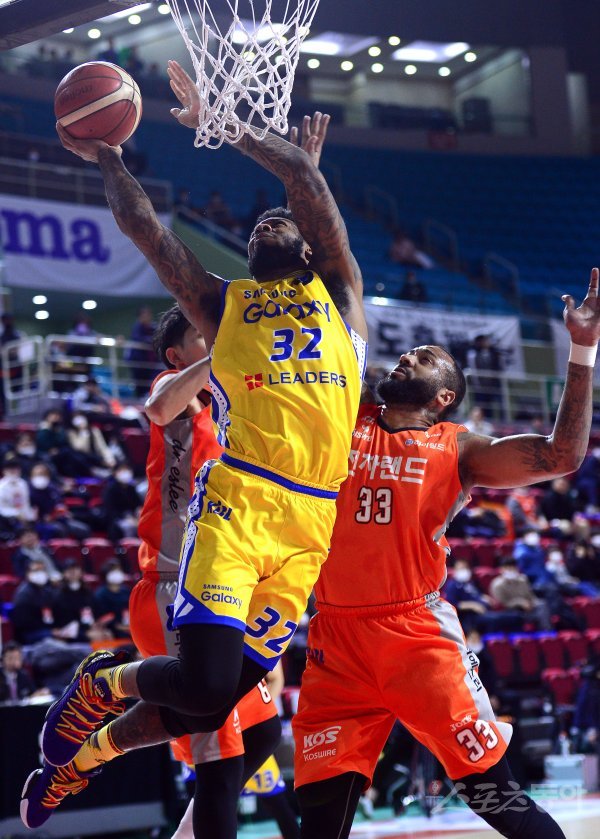 6일 인천삼산체육관에서 열린 ‘2019-2020 현대모비스 프로농구’ 인천 전자랜드와 서울 삼성 경기에서 삼성 톰슨이 전자랜드의 수비를 뚫고 골밑 슛을 하고 있다.