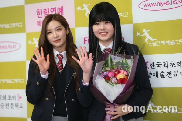 가수 명형서(왼쪽)와 전유진이 7일 오전 서울 송파구 한림예술고등학교에서 열린 졸업식에 참석해 포토타임을 하고 있다.